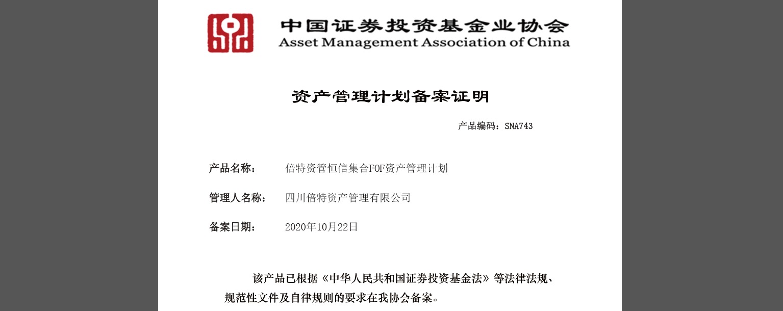 2020年10月21日,倍特期貨有限公司(以下簡稱“倍特期貨”)資產(chǎn)管理子公司——四川倍特資產(chǎn)管理有限公司(以下簡稱“倍特資管”)發(fā)起設立的資產(chǎn)配置策略私募FOF產(chǎn)品“倍特資管恒信集合FOF資產(chǎn)管理計劃”成立,并于10月22日通過中國證券投資基金業(yè)協(xié)會備案。瀏覽 : 9117分享