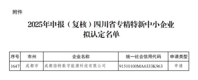 倍特數(shù)能獲四川省專精特新中小企業(yè)認定