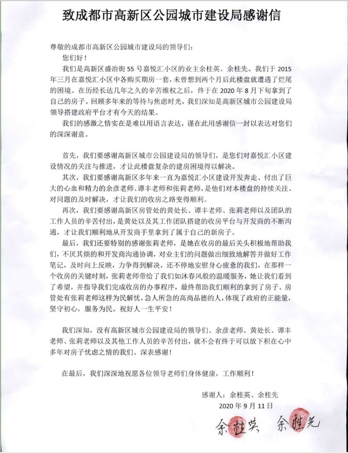 近日,由成都倍特建筑安裝工程有限公司承建的嘉悅匯A標(biāo)段,歷經(jīng)多方努力,已基本完成了小業(yè)主的交付工作。2020年9月11日,高新發(fā)展法務(wù)部借調(diào)到公園局的張莉同志收到來自嘉悅匯小業(yè)主余桂先、余桂英兩位女士贈送的繡有“為民解憂、盡職盡責(zé)”、“思民生、解民難、做實(shí)事、暖民心”的錦旗及表揚(yáng)信。兩位業(yè)主對張莉同志所提供的服務(wù)給與了高度的贊揚(yáng)和誠摯的感謝。瀏覽 : 13181分享